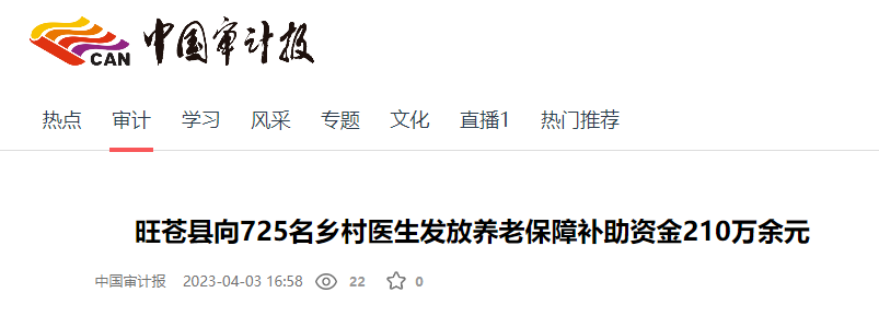 除了廣東之外,國家多地也在老年村醫問題上發力。據中國審計報的數據,四川旺蒼縣審計局發現衛監局未及時向符合條件的725名村醫發放補助資金。