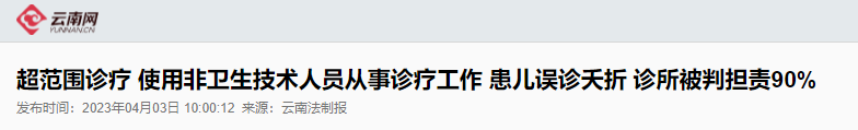 近期,云南網發布了一篇報道,一家診所因為讓非衛生技術人員進行診療,導致一兒童夭折。診所被判負90%的責任,共計賠償90多萬元。