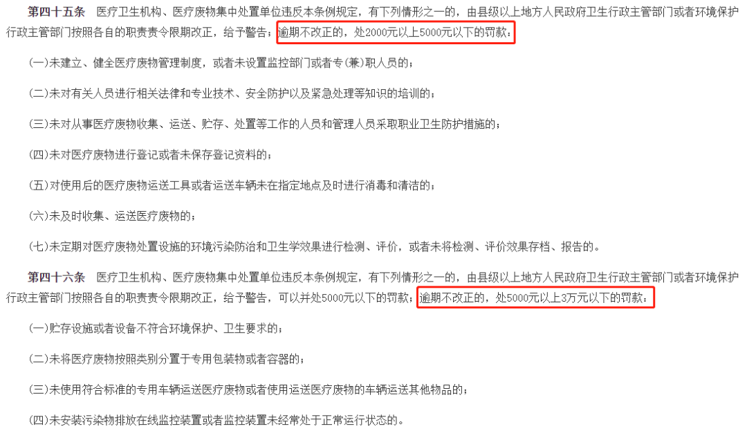 一個(gè)是在非儲存地點(diǎn)放置大量醫(yī)療廢物,將生活垃圾混入醫(yī)療服務(wù),收到6500元罰款;另一個(gè)是讓醫(yī)療廢物流失,收到1.5萬元以上的罰款。
