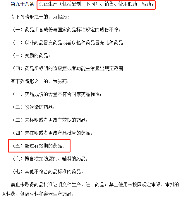我們來看看相關(guān)法律規(guī)定:根據(jù)《中華人民共和國藥品管理法》規(guī)定“有下列情形之一的,為劣藥,其中第五條明確規(guī)定“禁止使用超過有效期的藥品”。