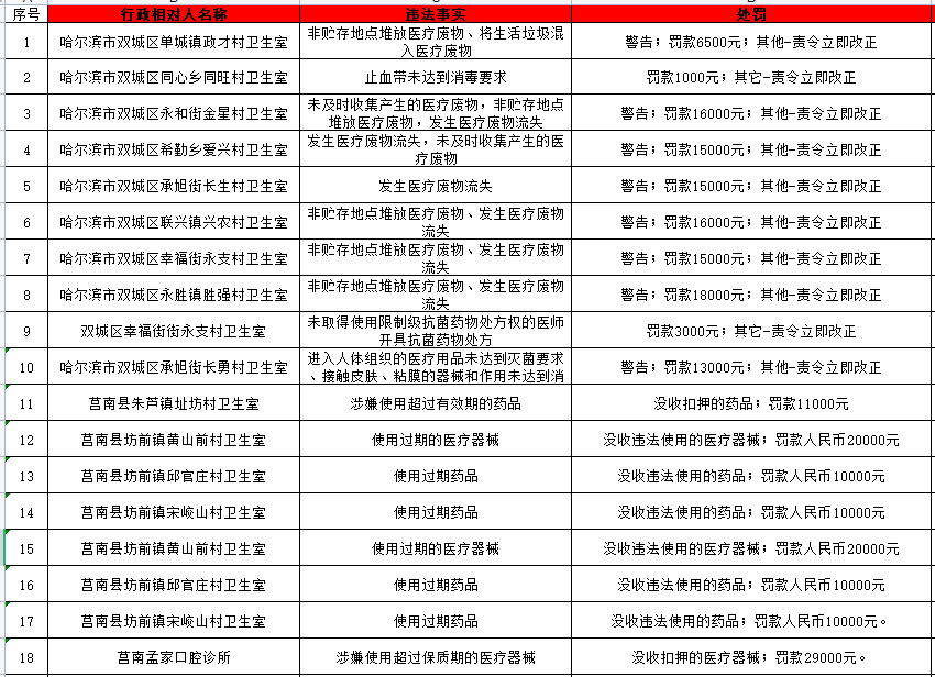 4月20日哈爾濱市雙城區(qū)當(dāng)?shù)?0家村衛(wèi)生室因違反規(guī)定,被處1000~18000元的罰款,其中有7個(gè)罰單金額超1萬元。